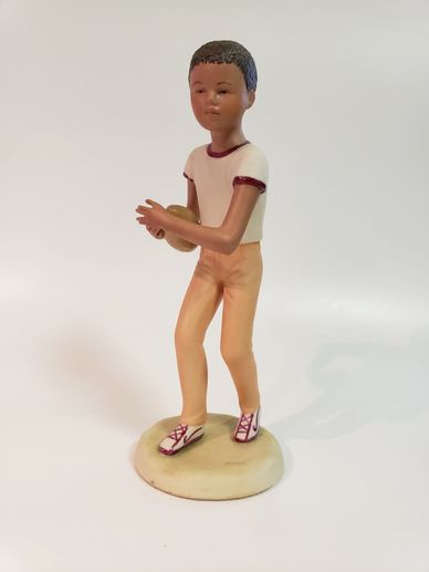 Released as an open edition, the Football Player was the only black child portrayed in a full figure sculpture. The studio had previously released two child head busts of black children, Jason and Jessica. Young Football Player remained available through the 1999 price list.
