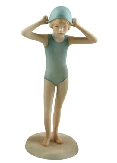 This simple piece with no added lace, ribbon or floral adornment reflects the status of the studio at the turn of the century. Any items introduced had to be minimal in design and easy to produce. The staff was long gone and only a few key people were retained on commission when needed. Items ordered needed to be quick turn with minimal complexity. This ballerina's refreshing simplicity actually makes her a very lovely piece. It is far preferable to see a well executed design in minimal form rounding out the decade (and the century) as opposed to another recycled part from a previous sculpture with gaudy attachments.