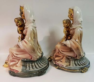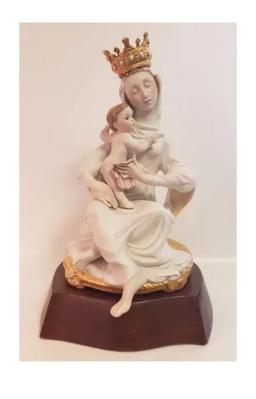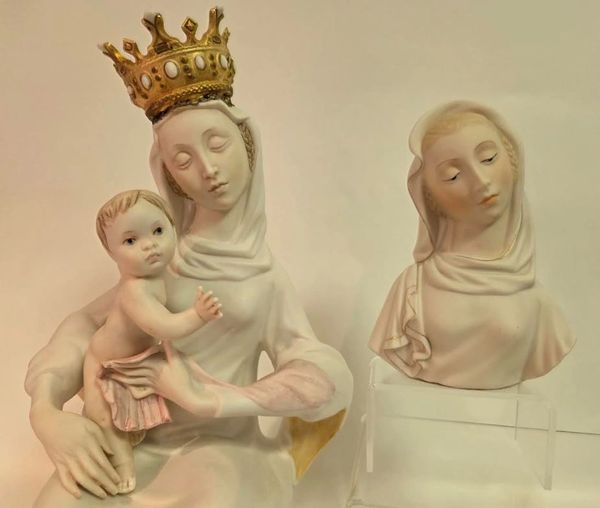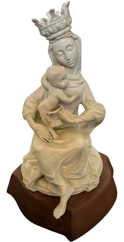As one of the later editions, this all white bisque copy has the crown and is mounted on a walnut base. The House of Gold Madonna was offered in several finishes, with a number of documented variations through the 50's and 60's. As spectacular as the color variations are, the all white Parian porcelain sculpture on the walnut base, showcases the translucent brilliance of the Parian bisque. The soft lines and subtle features of this piece bring the sculpture to life in a unique way, as anyone beholding the Mother and Child see new detail often hidden by color.