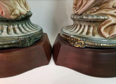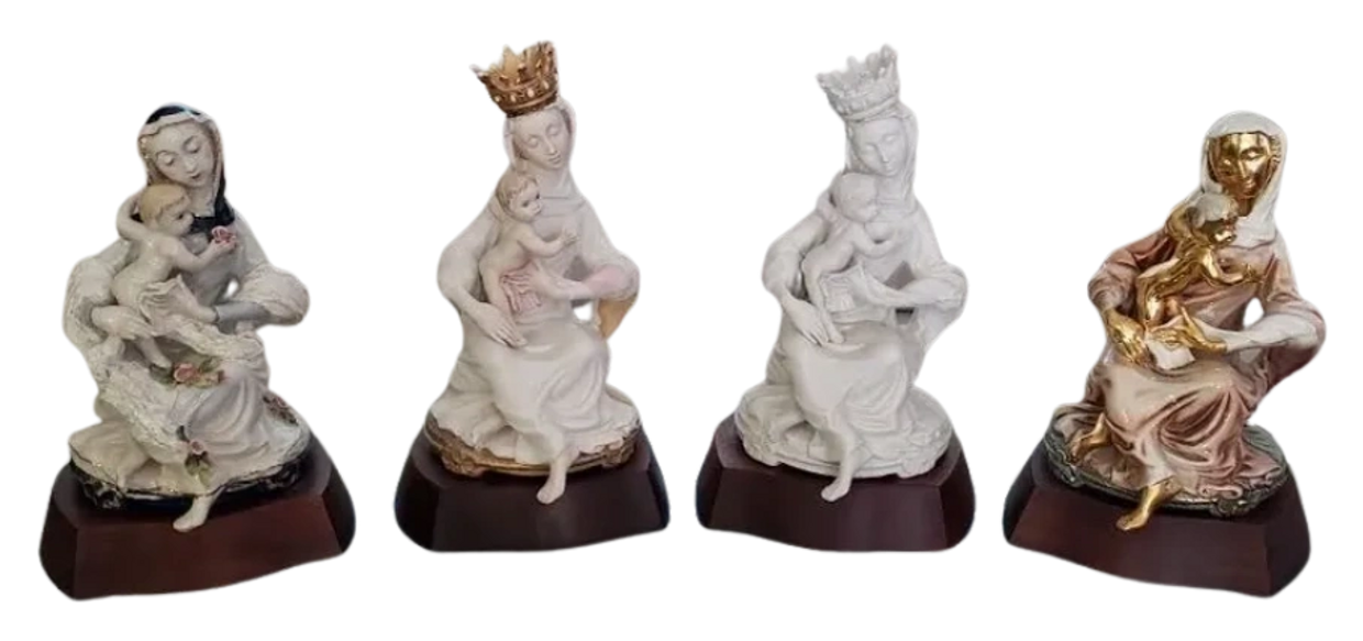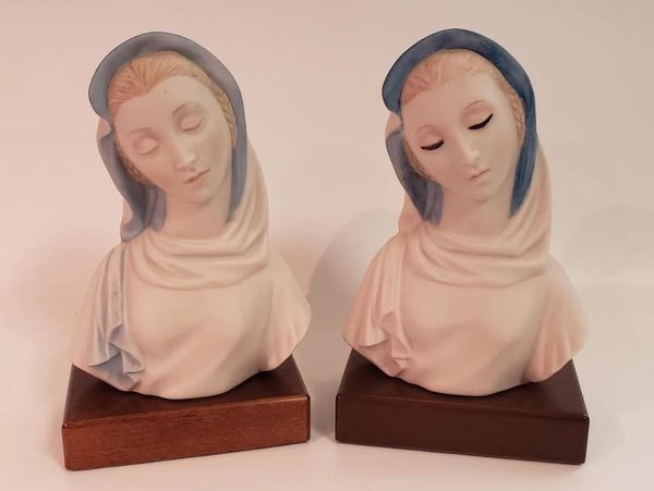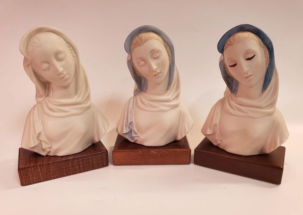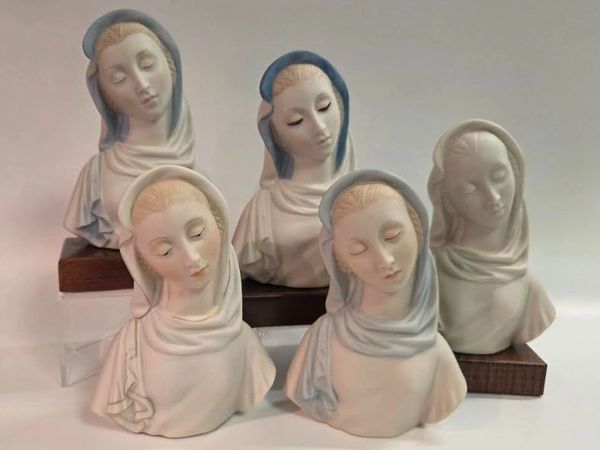 Of the six known variations of this sculpture, five are shown together here. The three on wooden bases are from 1969-1970. From the top left is the first color introduction. The inside of her veil is in blue. The second version did not have any blue on the portion of her veil that drapes over her shoulder but does have heavy eye liner. The third version was the Parian White version on the wooden base.
