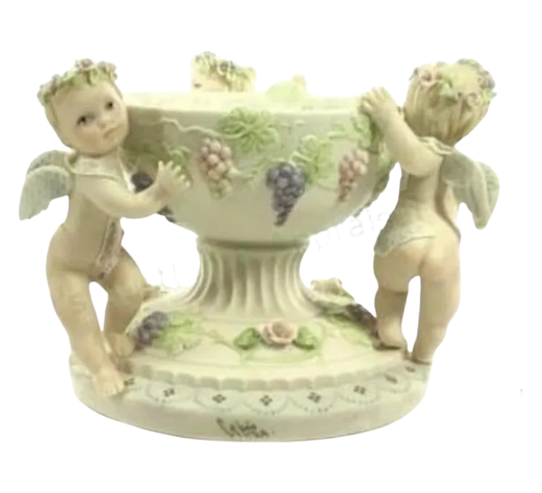 The same cherub ornament was given a crown of roses and used in triplicate to surround the compote shown above. Note the single rose with a leaf on each side. This is reminiscent of the early 1950's floral adornments seen on the earliest religious pieces and nearly all Cordey China sculptures.