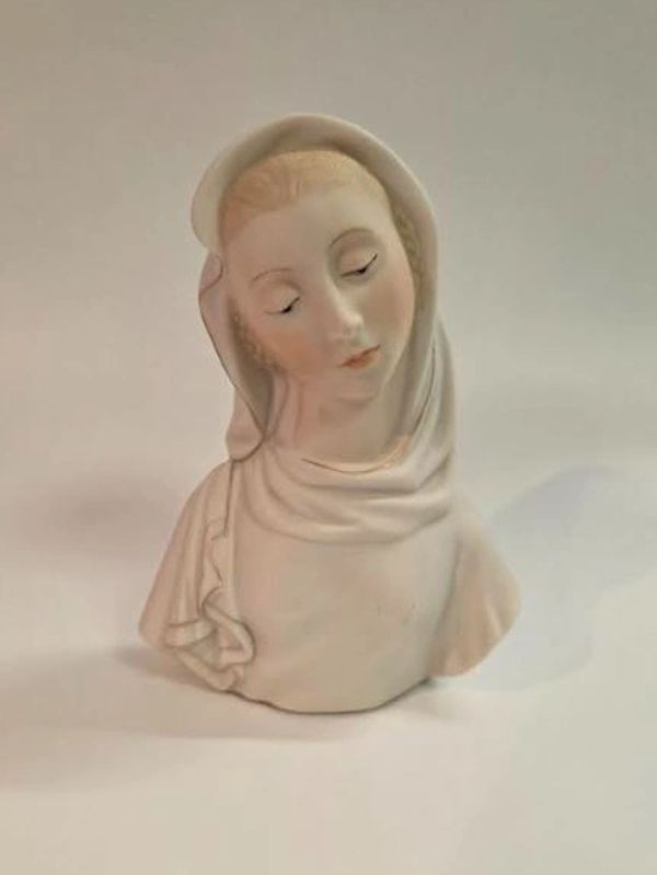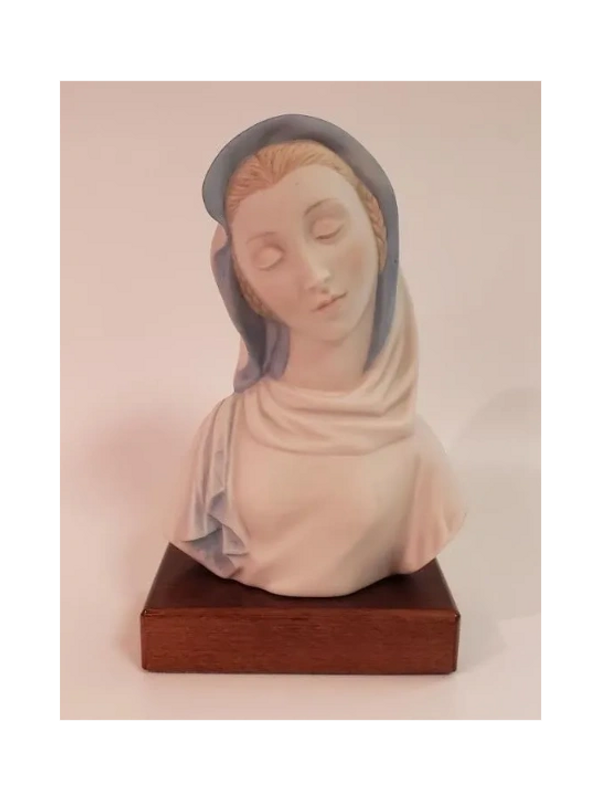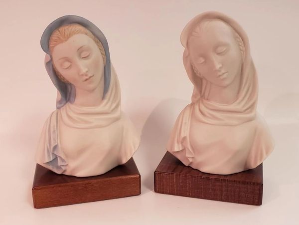 While the House of Gold Madonna was retired in 1965, just three years later she was resurrected, or perhaps, decapitated and reintroduced simply as Madonna 5 1/2" under the design number 2152. She was released in 1968 in color only and attached to a wooden base. Minor adjustments were made to her hair and veil in absence of the crown. This sculpture reflects simple elegance with subtle color and shades of blue complimenting the veil draped over her shoulder.