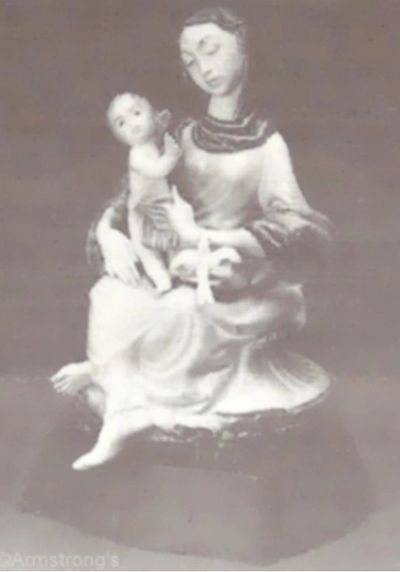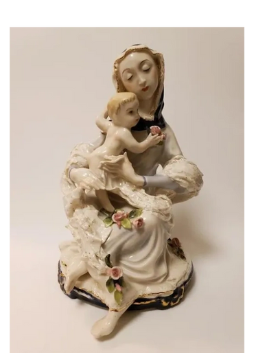 This early copy was likely from the late 1950's. The first clue is it sits on a base. After transitioning this sculpture from the Cordey China line to the Cybis Porcelain line, the lace and rose adornments were removed. Examples in Stained Glass color have been found sporting the refined "cleaner" look. The next rendition appears to have added the dove on Mary's knee and the obvious addition of the wooden base. The final version would lose the dove while Mary gained a crown.
