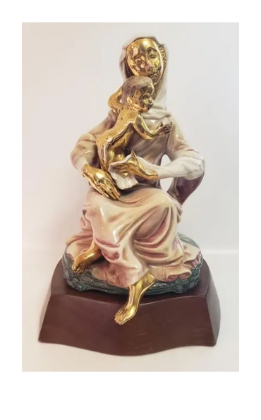 This unique variation, where 24 karat liquid gold was applied to the exposed skin surfaces, was available in the late 1950's. Old Coin Gold as a primary decoration was expensive and produced in minimal numbers. Old Coin Gold sculptures were considered the "top of the line" of the Religious Art collection. Hailed as one of the studio's greatest designs issued in the Religious Art category from the 1950's, House of Gold in Old Coin Gold is a truly rare sculpture and prized by any collector fortunate enough to own one.