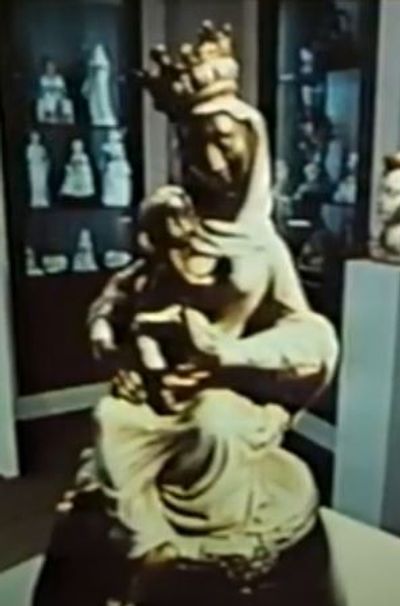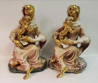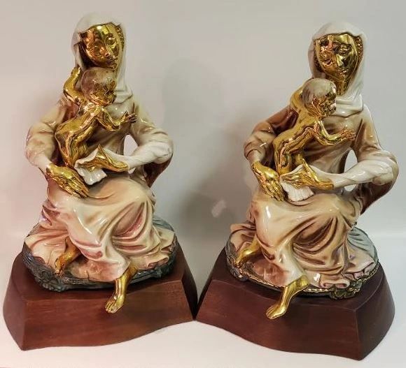 This item was offered for sale at the studio in Trenton as the House of Gold Madonna in the Old Coin Gold as a Primary finish with the crown. Note the base Mary sits on (bottom part of the porcelain sculpture) is lighter in color. It's not the dark green as seen on other Old Coin Gold pieces. It is likely there were many other variations created in different finishes, with bases and crowns.