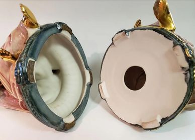 During the production process it was frequently necessary to modify sculptures. This usually happened after several copies had been sold. Problems in production, firing, packing and shipping dictated such changes. Here we see a minimal color variation where the newer piece on the left has less gold accenting around the base. This could have been an artist's oversight or a cost saving decision as 24k gold liquid paint was used in this process. We also see the bottom of the base was changed to accommodate a different way of attaching the porcelain to the wooden base. Both utilized toggle bolts to attach the sculpture to the base.
