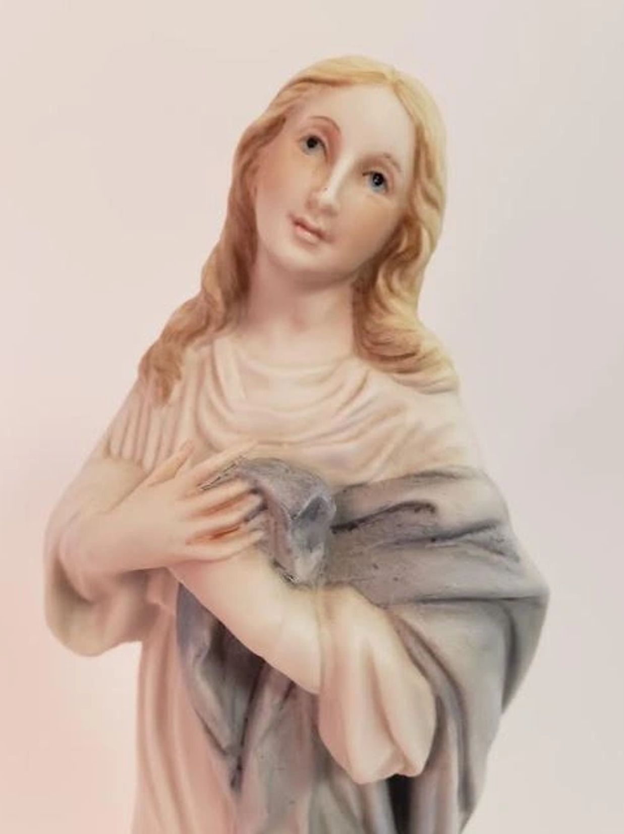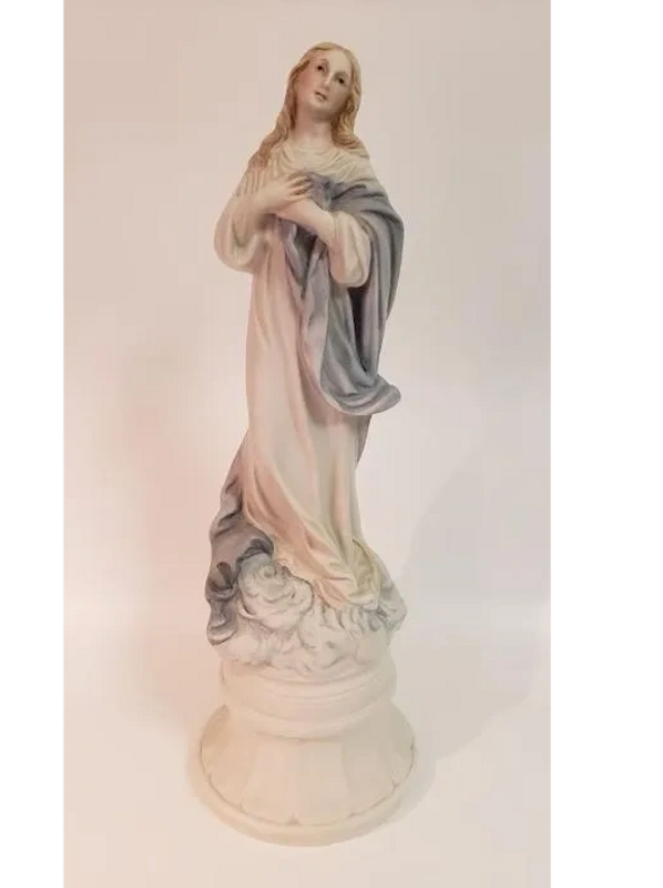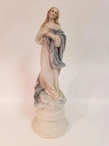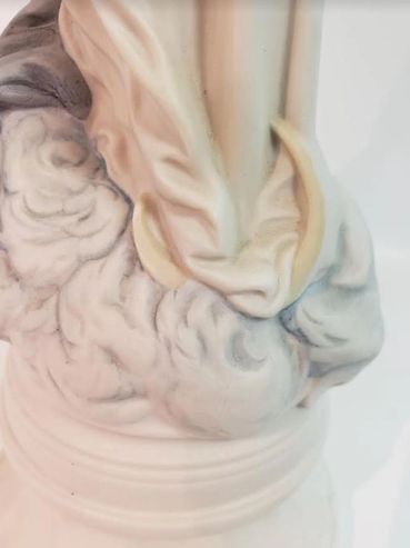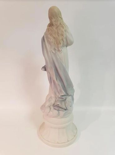 As with many of the Religious Collection sculptures, The Assumption of the Blessed Virgin was updated, given a new design number, a new title and a new finish. The redesign of this sculpture removed the floral adornment and slightly modified the design on the base. The finish was changed to the matte color in Parian only. This version has been found in Parian white and color with themes in blue or yellow. There was no change to the size of the sculpture with the revision.